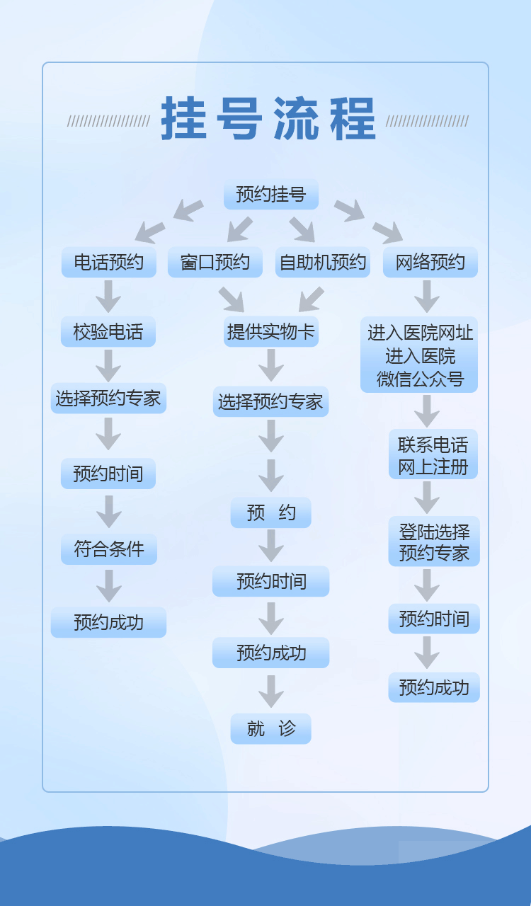 3、“三大平台”便捷服务:以网络咨询、电话预约及来院挂号三个平台,全天候服务大众,各环节紧密合作,让患者不做任何无谓的等待。